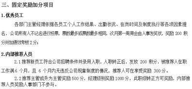 內(nèi)部推薦人員:推薦新員工入職轉(zhuǎn)正200 積分,六個(gè)月無(wú)違反公司規(guī)章制度記錄300積分,晉升為公司主管或者經(jīng)理加分更高。